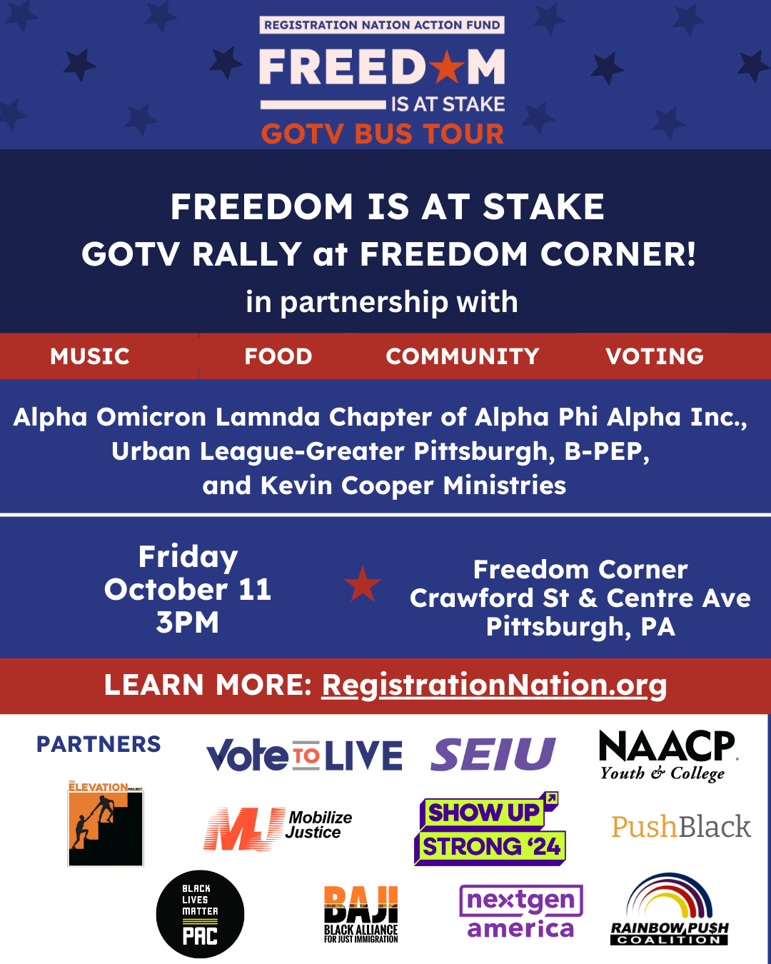 Following a successful launch in Ohio and stops in Philadelphia, the GOTV Tour makes its way to Pittsburgh to engage Black voters, youth, and underrepresented communities in partnership with Alpha Phi Alpha Fraternity, Inc., Alpha Omicron Lambda Chapter (Pittsburgh, PA), The Urban League of Greater Pittsburgh, The Black Political Empowerment Project (B-Pep), and Kevin Cooper Ministries. The tour will make stops in the Hill District and Park at Freedom Corner, a historic civil rights landmark, to energize voters and promote early voting.